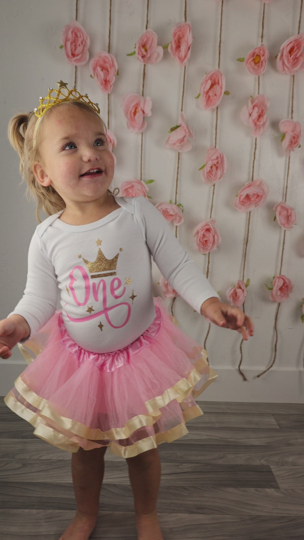 Pink & Gold Crown 1st Birthday Outfit for Girls – Long Sleeve Bodysuit, Tutu Skirt & Tiara Headband Set